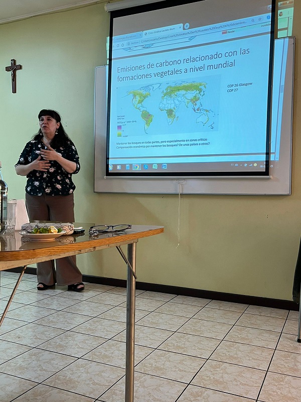 Ante un pequeño grupo de jóvenes de enseñanza media y universitaria, la Dra. En Biología, Alejandra Zúñiga Feest habló desde la ecología y territorialidad. Puso de manifiesto en su exposición las “fake news” (noticias falsas) sobre el cambio climático; la necesidad de visibilizar más el tema del cuidado de la casa común – “no se puede amar lo que no se conoce” enfatizó – y el aporte que Laudato Deum puede hacer en ese sentido-, entre otros alcances.