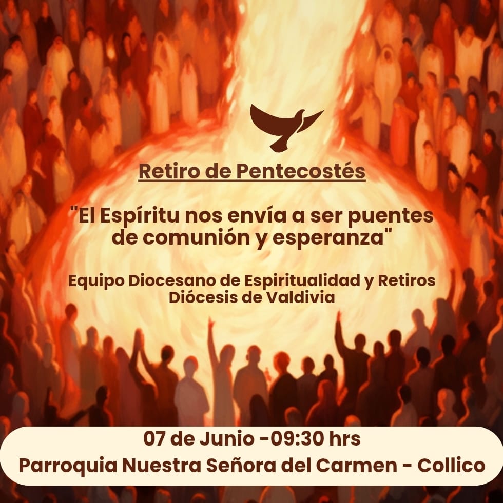 Nuestra diócesis invita a un retiro de preparación para Pentecostés, el sábado 07 de junio de 9:30 hrs. a 13:00 hrs. en la Parroquia Nstra. Sra. del Carmen en Collico (Balmaceda 5215).